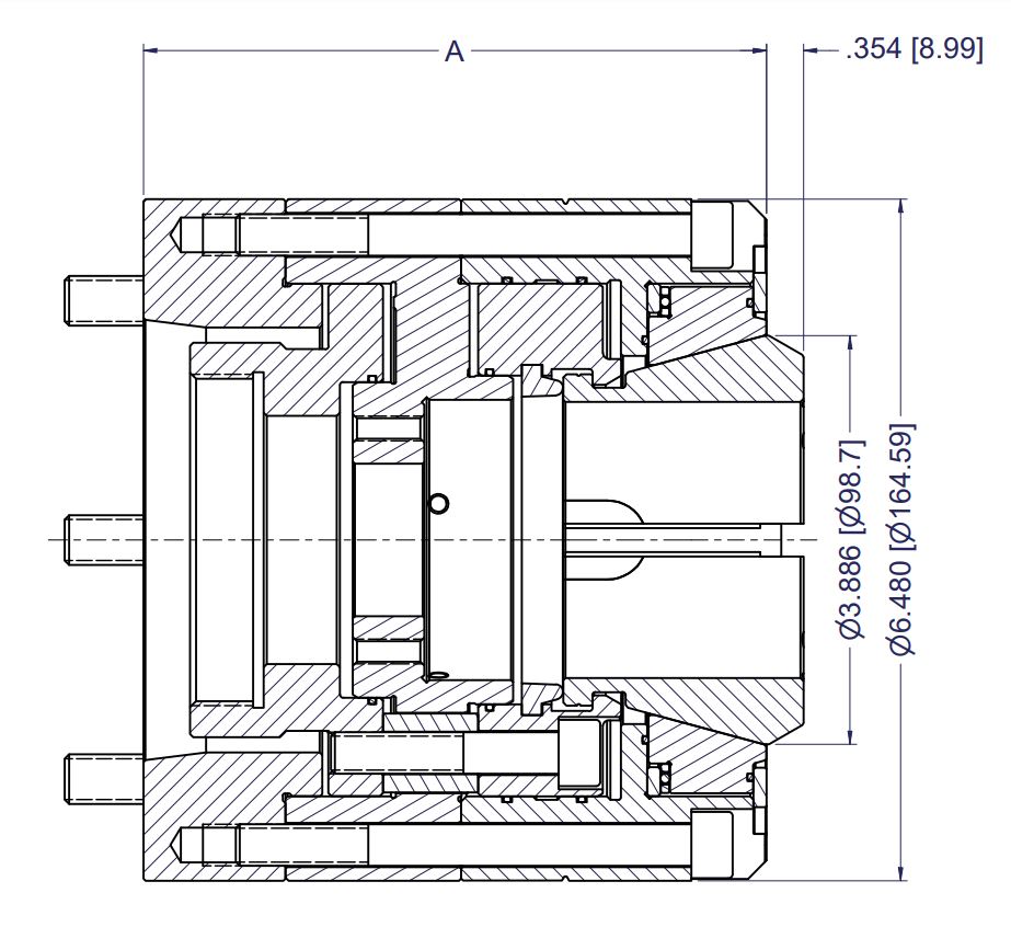 The CB-AG series collet chuck is a pull back design with a floating collet seat for machining shafts between centers. Centers or other part locators are mounted in the ID of the chuck. The floating collet seat can also be locked out to clamp parts on-center. Compact OD and short length compared to other compensating chuck designs provides greater rigidity.